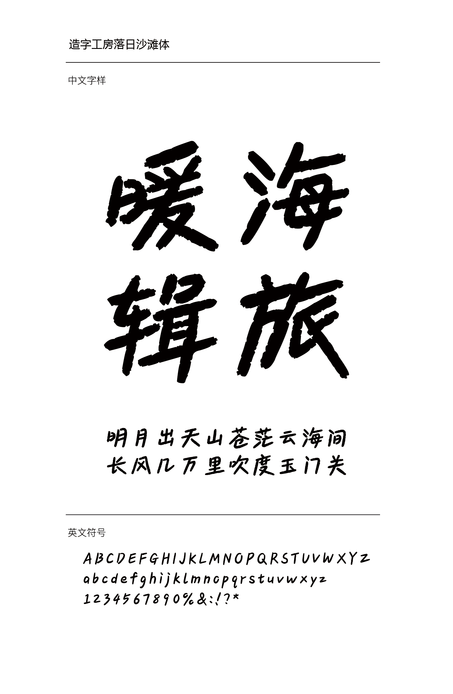 造字工房落日沙滩体,笔画轻盈随性,结构松散自在,风格清新治愈,运笔自然流畅,疏密得当,传递出字体的松弛与灵动,是一款适配日常笔记、海报等辨识度超高的字体。本字体为简体字库,采用OpenType/CID格式,Adobe-GB1-5编码。基于中华人民共和国GB2312-80字符集标准,另按需添加101个汉字。共收容字数6864CJK汉字,ASCII常用字符100个。